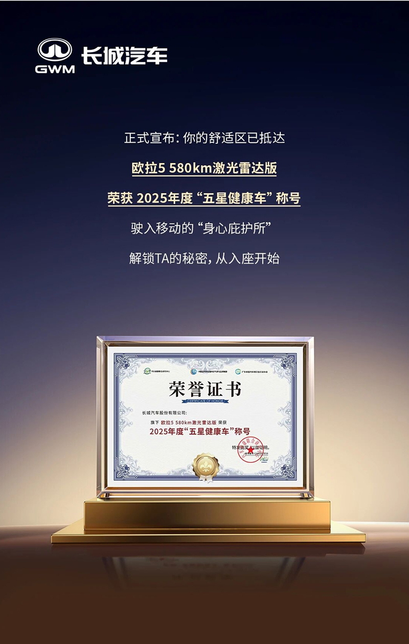 近期,长城欧拉5荣获中汽研—汽车健康联合研究中心颁发的2025年度“五星健康车”称号。在严苛评测中,欧拉5几乎做到“零苯零醛”,并拥有超99%的抑菌率与超95%的驱螨率,配合15.6英寸“莱茵三重护眼认证”中控屏,为用户构筑起呼吸与视觉的双重健康防线。