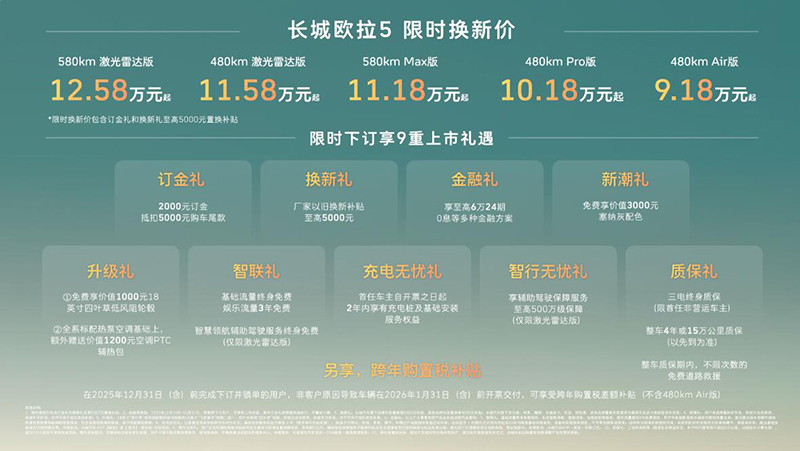 为了让这份“全球严选”触手可及,长城欧拉5推出了极具诚意的上市政策:新车建议零售价区间为9.98万至13.38万元。更为惊喜的是,即日起至2025年12月31日,用户下订并锁单,即可尊享限时换新价9.18万元起(含至高5000元以旧换新补贴)。此外,购车还可享受包含订金礼、新潮礼、智行无忧礼在内的9重上市好礼。针对全系车型(480km Air版除外),在2025年12月31日(含)前完成下订并锁单的用户,非客户原因导致车辆在2026年1月31日(含)前开票交付,更可享跨年购置税补贴 。