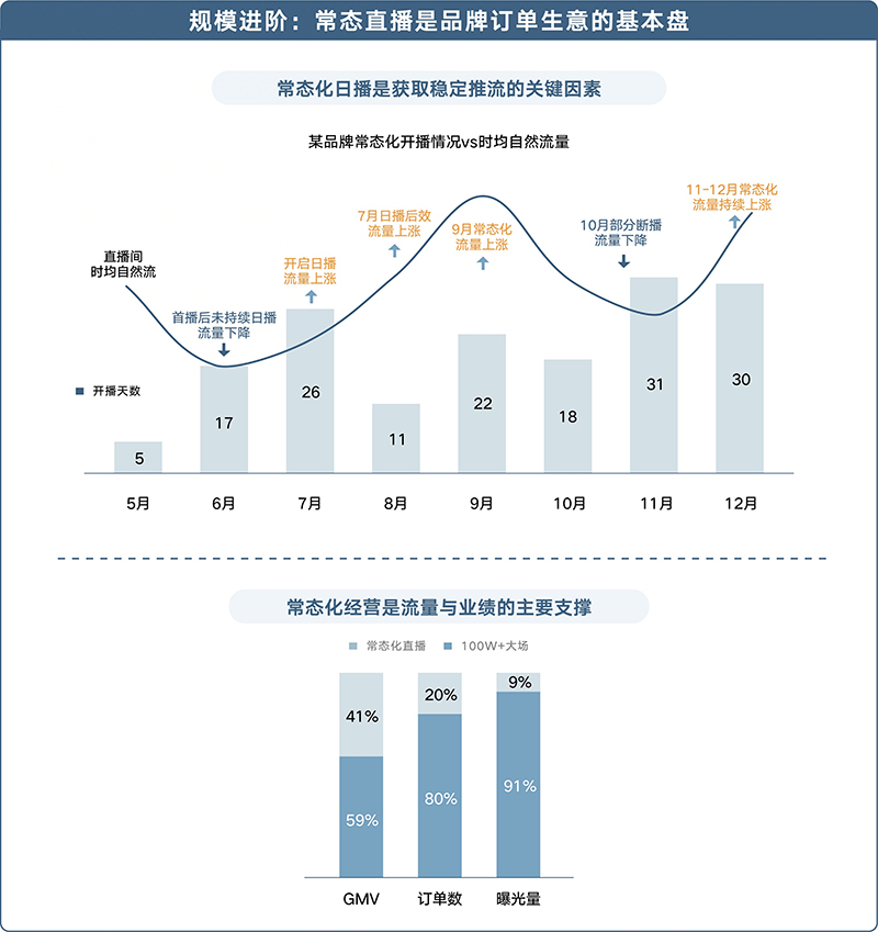 首先是坚持常态化直播,保证场次与时长。 数据表明,品牌常态化开播期间,除了获取更多订单,转化效率和放量空间均更优,GMV增长带来的激励订单也更多;此外稳定的开播时长也很重要,单场开播超过8小时的直播间,拥有更多的订单空间和放量潜力。延续期不仅要“坚持播”,也要“播得久”——通过足够的开播时长,获得更充分的流量利用效率和订单转化能力。