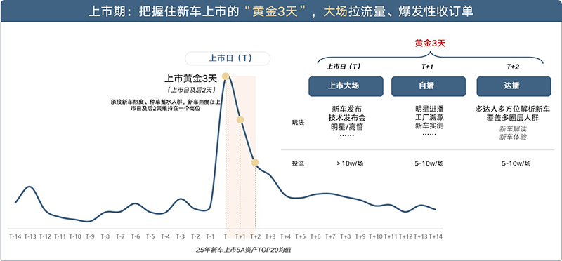 上市3天是新车热度的最高峰,也是订单转化的黄金窗口。这一阶段的核心策略是“大场拉流量、爆发性获取订单”,可通过自播与达播的组合搭配:自播方面可安排明星进播、工厂溯源、新车实测等内容,达播方面可通过多达人多方位解读覆盖多圈层人群。黄金3天的重点:用最大资源接住最高热度,将前期蓄水的种草人群集中转化为支付订单。