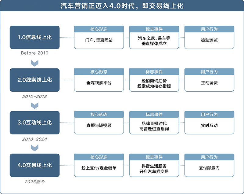 第四阶段(2025年至今)交易线上化:以抖音生活服务推出汽车抵扣券为里程碑,“先买券、再核销”的模式正式落地,用户意愿的度量标准从“留资”变为“支付”,标志着汽车营销进入“支付即意向”的全新时代。