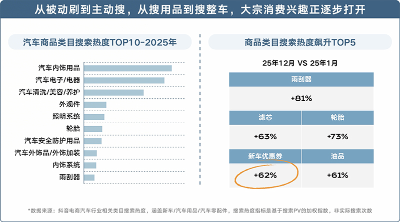 更值得关注的是,搜索的品类结构也在发生变化。在用户普遍热搜的内饰用品、清洗养护等低单价、高频次的汽车用品之外,“新车优惠券”的搜索增长率跻身前列,用户的搜索行为正从“为爱车添置小件”向“为购车锁定优惠”延伸,大宗消费的兴趣边界正在被打破。