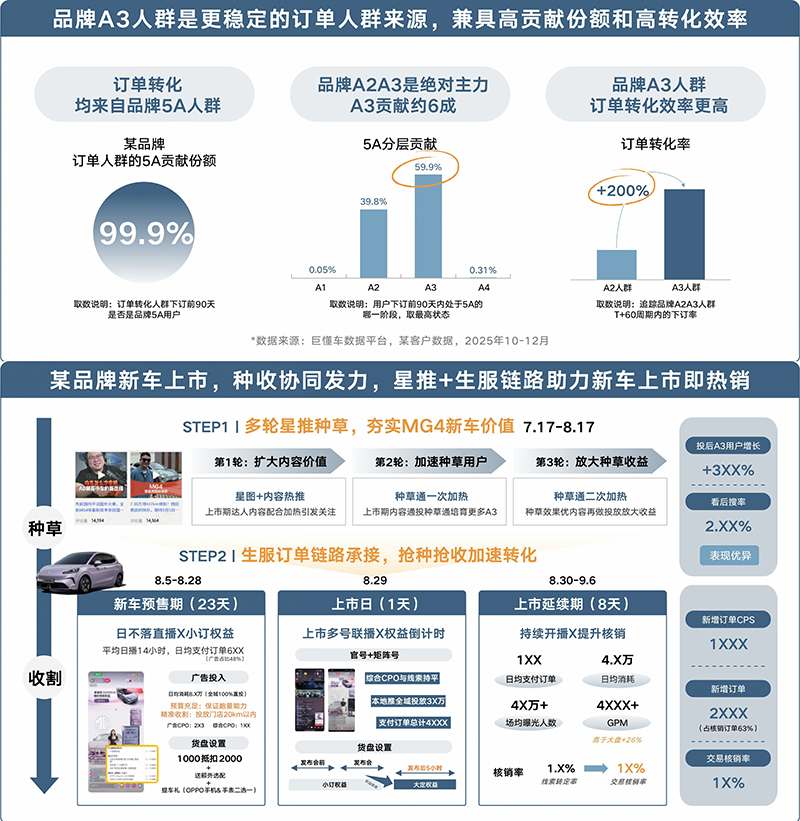 订单的达成从来不是一蹴而就,背后存在着长期的、潜移默化的影响过程。某品牌订单人群中,99.9%来自品牌5A用户,其中A2(吸引人群)和A3(种草人群)是绝对主力,更重要的是,A3人群的订单转化率比A2人群高出200%,用户被种草后的下单意愿发生了质的跃升,某品牌新车上市案例也验证了这一路径。