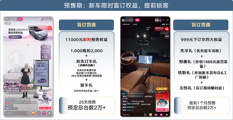 新车正式发布前30天左右进入预热期,核心目标是“提前锁客攒热度”。这一阶段重点是预售场,核心动作是推出“限时盲订权益”。从品牌实战效果看,通过抵扣券+各类礼包+购车权益,同时承诺“盲订期随时退”,降低用户决策门槛,最终在盲定期取得了可观战果。盲订不是卖车,而是卖“优先权”和“专属感”,通过权益叠加让用户愿意为“抢先拥有”支付意向金。