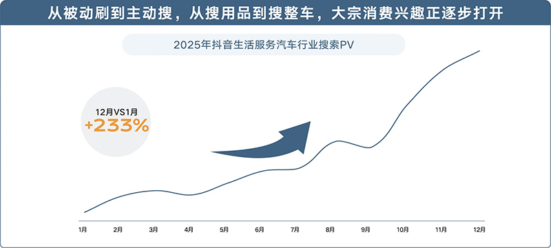 在以抖音为代表的内容平台上,用户正呈现出从“被动刷”到“主动搜”的显著变化。2025年抖音生活服务汽车行业的搜索PV大幅增长,用户不再满足于算法推荐的内容,而是带着明确意图主动探寻信息。