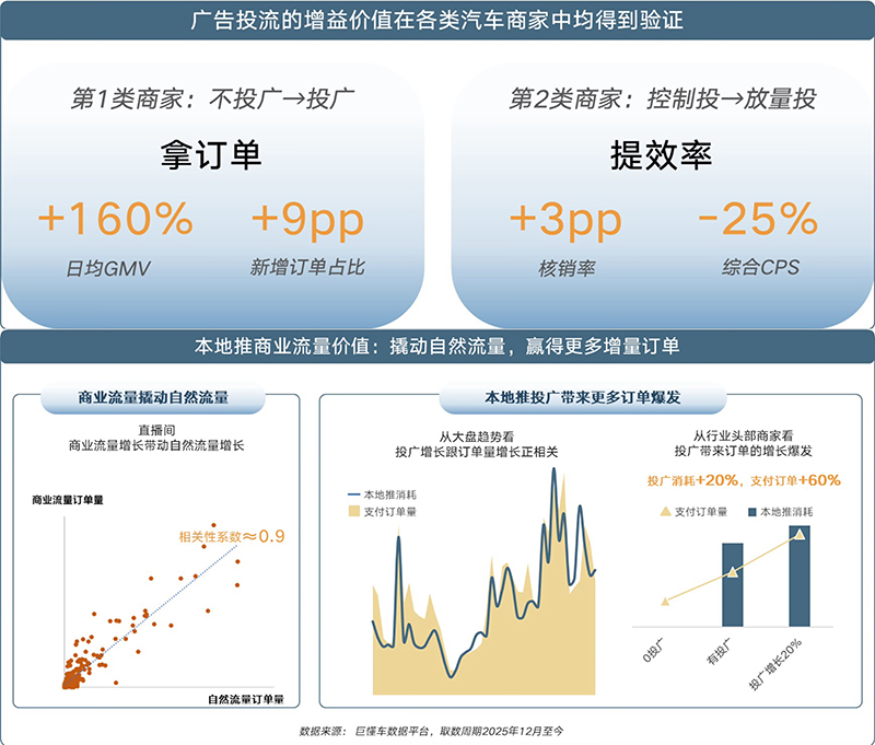 在抖音生活服务汽车交易中,广告投流不是单纯的“花钱买流量”,而是撬动生意增长的有效杠杆。从几类商家的不同阶段表现看,投流不仅带来订单量的增长,还同步优化了转化效率和成本结构。从流量结构角度深挖,商业流量的增长会带动自然流量的同步提升,这背后的逻辑是:商业流量带来更高的直播间活跃度和转化数据,向平台算法传递“该直播间具备承接流量能力”的正面信号,从而获得更多自然推荐。对主机厂而言,这意味着投流策略需要从“要不要投”升级为“如何投得更有效”。