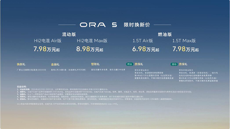 4月25日,长城欧拉在第十九届北京国际汽车展览会举办以“求实”为主题的品牌发布会。长城欧拉5混动版和长城欧拉5燃油版正式上市。其中,欧拉5混动版建议零售价8.98万元起,欧拉5燃油版建议零售价7.98万元起。现在下订更可享包含换新礼、金融礼、智联礼、质保礼在内的四重好礼,叠加上市权益后,欧拉5混动版限时换新价7.98万元起,欧拉5燃油版限时换新价6.98万元起。