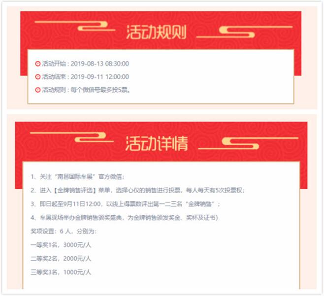 本次“金牌销售”评选活动将由网友投票产生金牌销售各类奖项,于913日在南昌国际车展现场颁奖,授予丰厚的奖金和奖杯/证书。