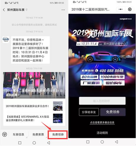1、关注“郑州国际车展”官方微信,选择菜单栏“免费索票”,点击“免费抢票”;