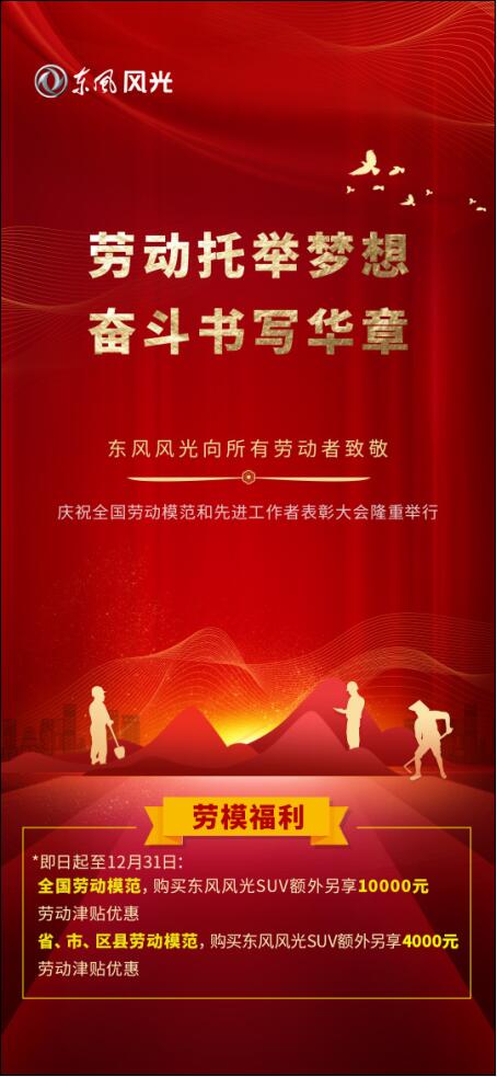11月24日上午,全国劳动模范和先进工作者表彰大会在北京人民大会堂隆重举行,本次大会以最高规格表彰了全国劳动模范和先进工作者。积极响应国家大力弘扬劳模精神、劳动精神、工匠精神号召,东风风光率先面向全国各级劳模推出劳模专属福利优惠,从即日起至12月31日,全国劳动模范购买东风风光SUV额外另享10000元福利优惠,与此同时,省、市、区县劳动模范,购买东风风光SUV额外另享4000元福利优惠。