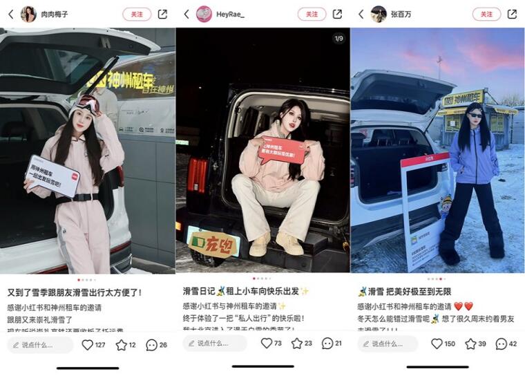 随着赵小棠的租车滑雪笔记率先打开声量,旅行、摄影、时尚穿搭等赛道的KOL也驾驶着从神州租车租赁的车辆,在这个冬天用自驾游的方式踏上了一场久违的租车滑雪之旅。