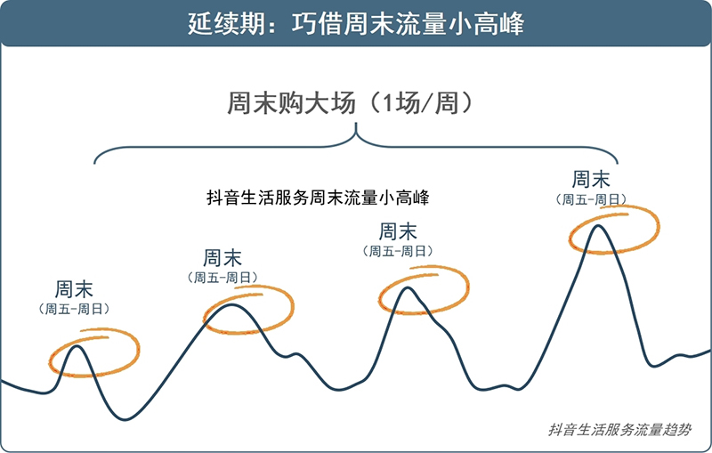 其次是巧借周末流量小高峰,每周一场“周末购”大场。 抖音生活服务流量在周五至周日呈现周期性小高峰,品牌应在此窗口集中资源,以每周一场周末购大场的节奏,持续种收。周末购不是简单的平播,而是利用周末用户活跃度高的特点,配合专属权益和适度投流,形成“一周一小爆”的稳定脉冲,确保新车在上市后一个月内持续有订单入账。