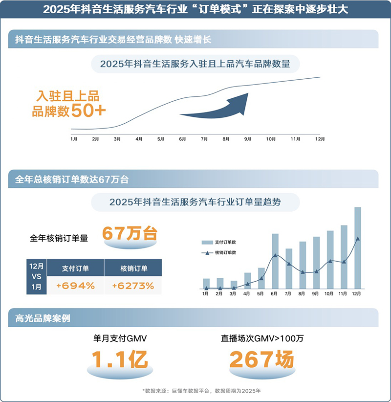 2025年,抖音生活服务汽车交易线上化正从试水逐步走向规模化验证。入驻且上品汽车品牌数量稳步增长,行业参与度持续升温。全年总核销订单数达67万台,增长曲线年末翘尾效应显著,用户对“先购券、再买车”模式的接受度快速攀升。