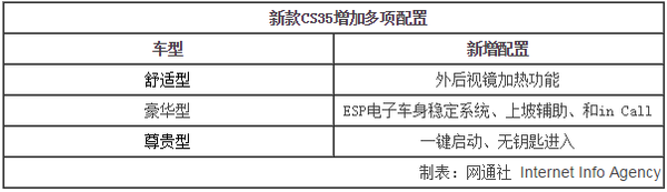新款CS35新增1.5T涡轮增压发动机,并有望推出两款全新车型—1.5T运动型和1.5T豪华运动型。此外,在其他车型配置方面均有提升。包括舒适型增加外后视镜加热功能;豪华型增加ESP电子车身稳定系统、上坡辅助、和in Call等配置;尊贵型增加一键启动、无钥匙进入两项配置。新车将在3月正式上市。
